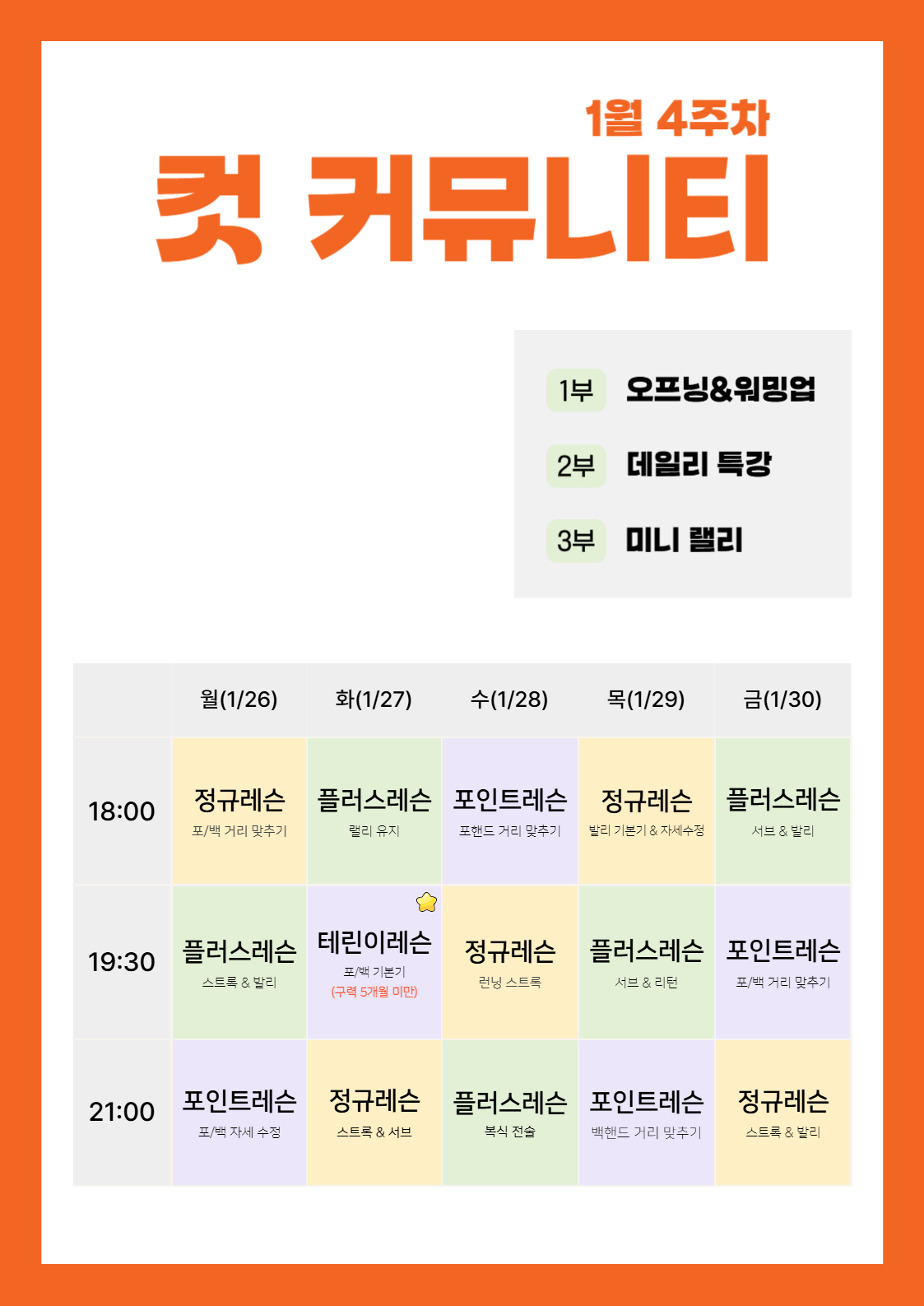 컷테니스 홍대점의 야외 풀코트 / 저녁 그룹레슨 시간표 예시