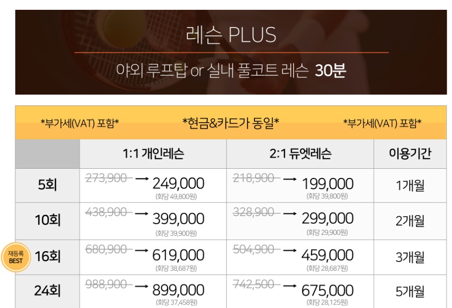이외에도, 초보지만 넓을 코트에서 치고 싶을 땐 PLUS 레슨권을 끊으면 된다.